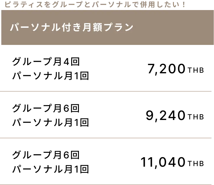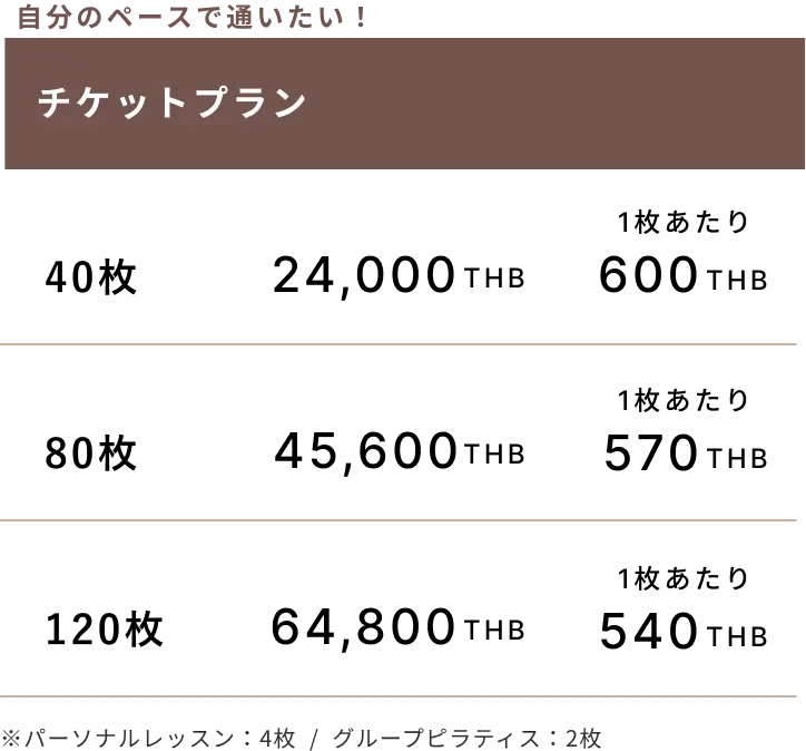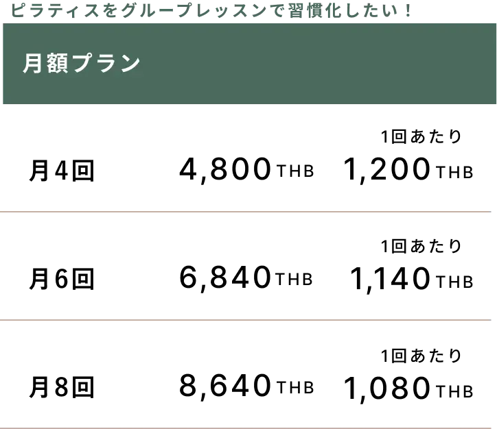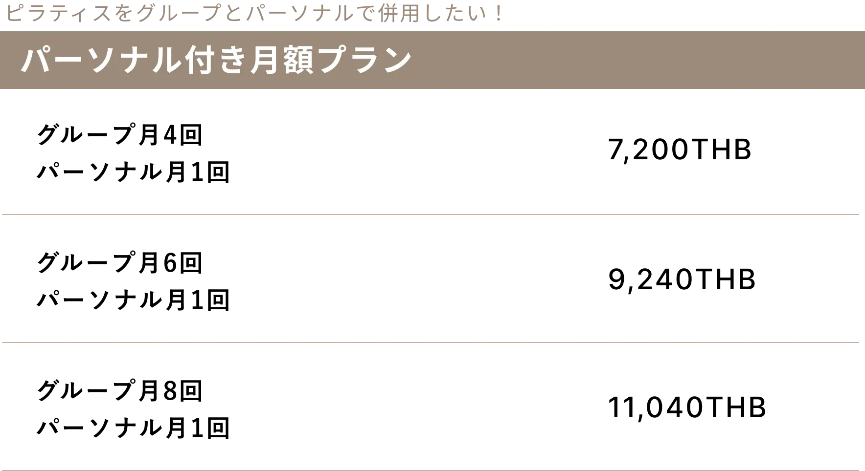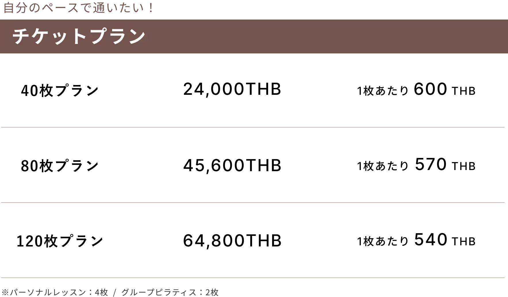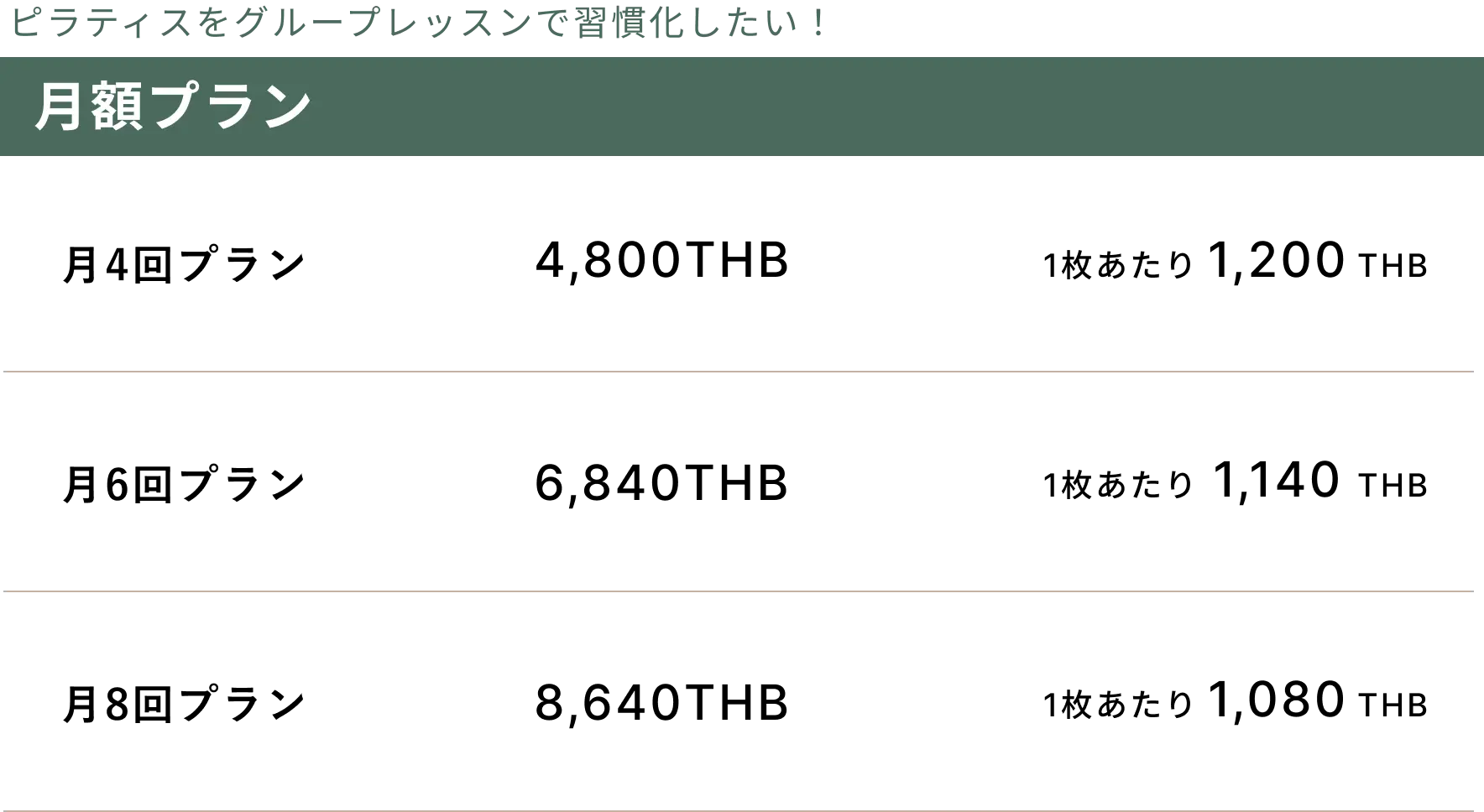 FMBではグループは500THB、パーソナルは1000THBで体験レッスンが可能です。