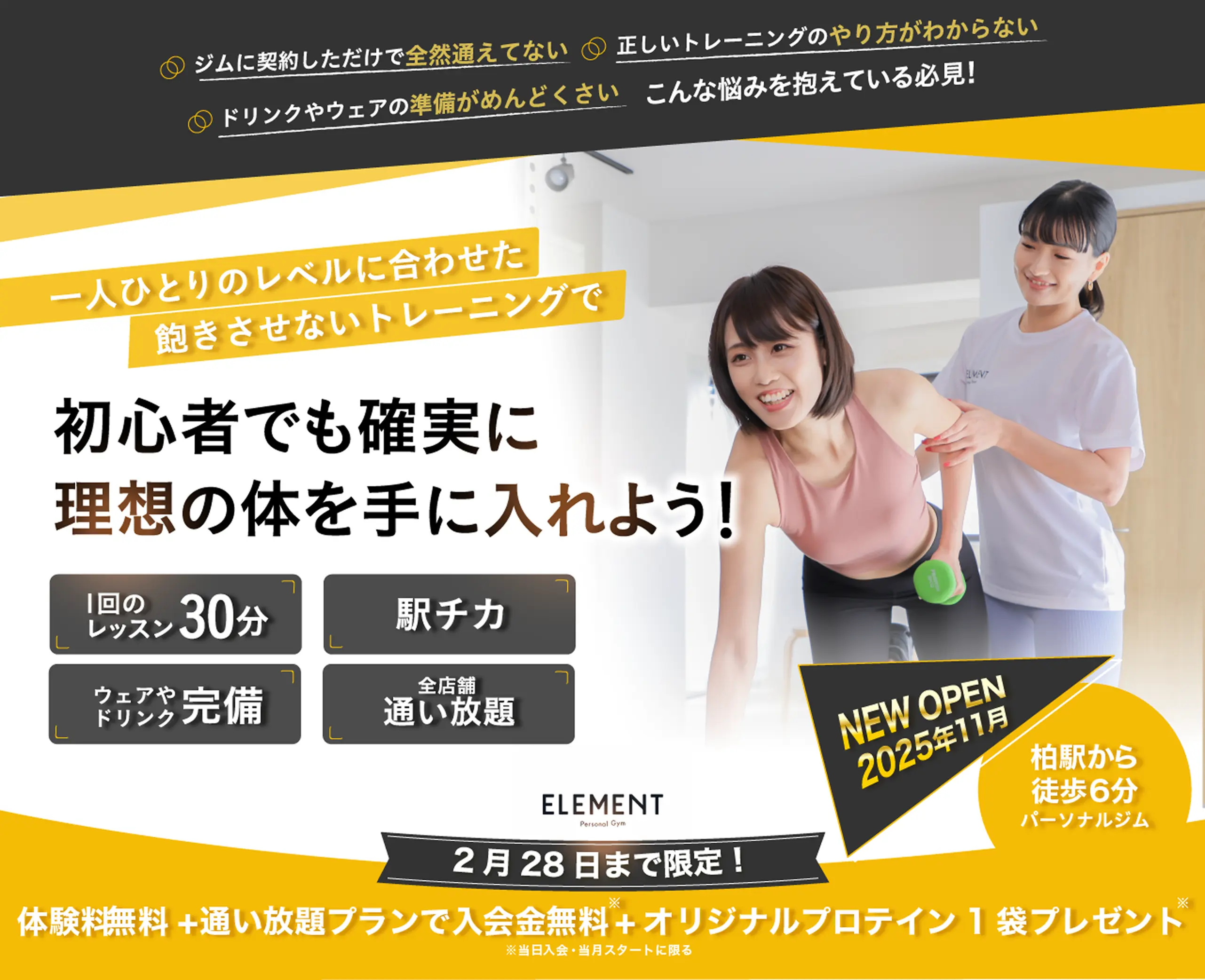 A. 大丈夫です。いままでに挫折したのは、「続ける仕組み」がなかったからです。ELEMENTのトレーニングは、「継続して習慣化すること」を目標として、継続できるプランを提案しています。また、トレーニングできつすぎる負荷をかけず、続けられる内容を組み、続けることを第一にしています。 習慣化さえできてしまえば、誰でも結果が出せるので、ご安心ください。