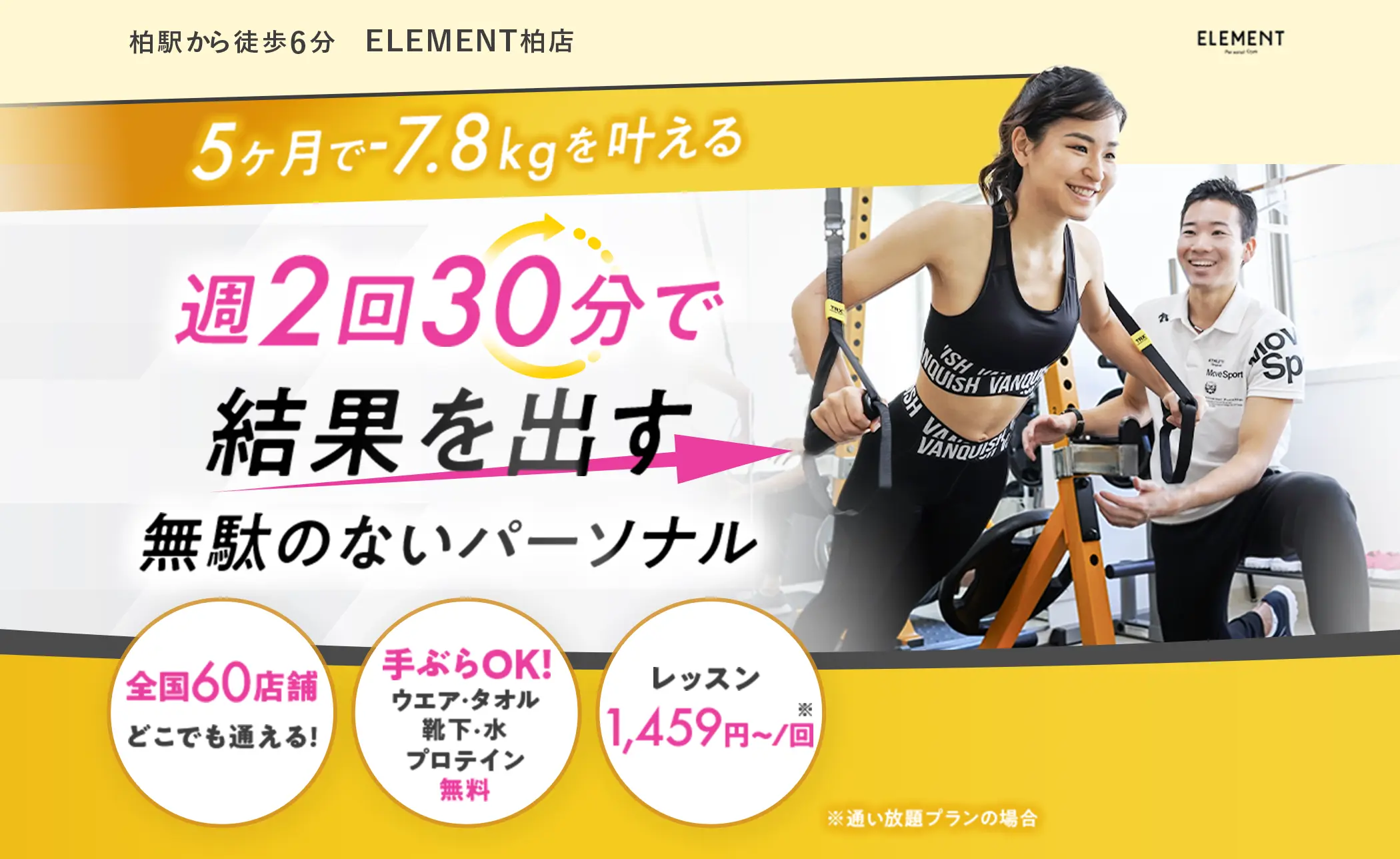 そこでELEMENTでは、業界最安値の1回1,459円〜という値段設定にいたしました。内装など徹底的に無駄なコストをカットしつつ、トレーナーや機材にはこだわり、お客様が続けやすい環境を実現しました。