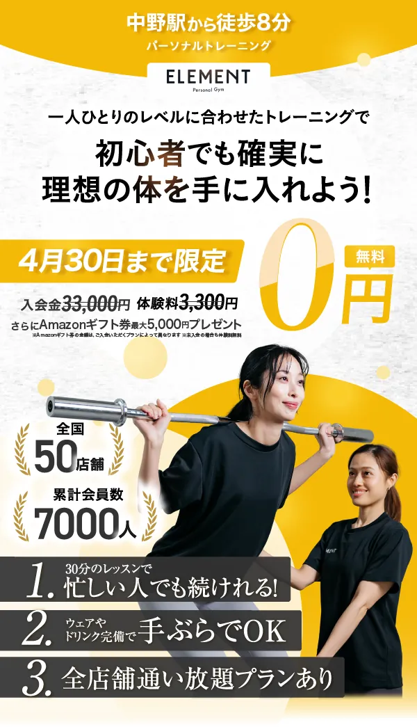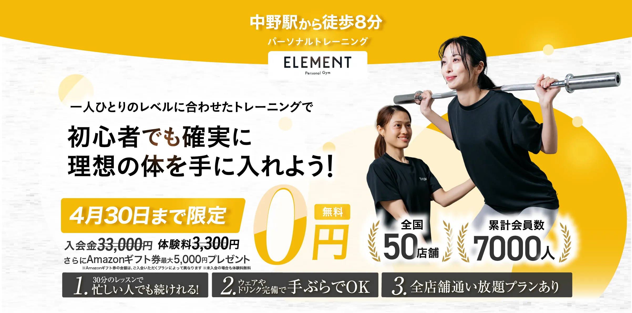 そこでELEMENTでは、業界最安値の1回1,459円〜という値段設定にいたしました。内装など徹底的に無駄なコストをカットしつつ、トレーナーや機材にはこだわり、お客様が続けやすい環境を実現しました。