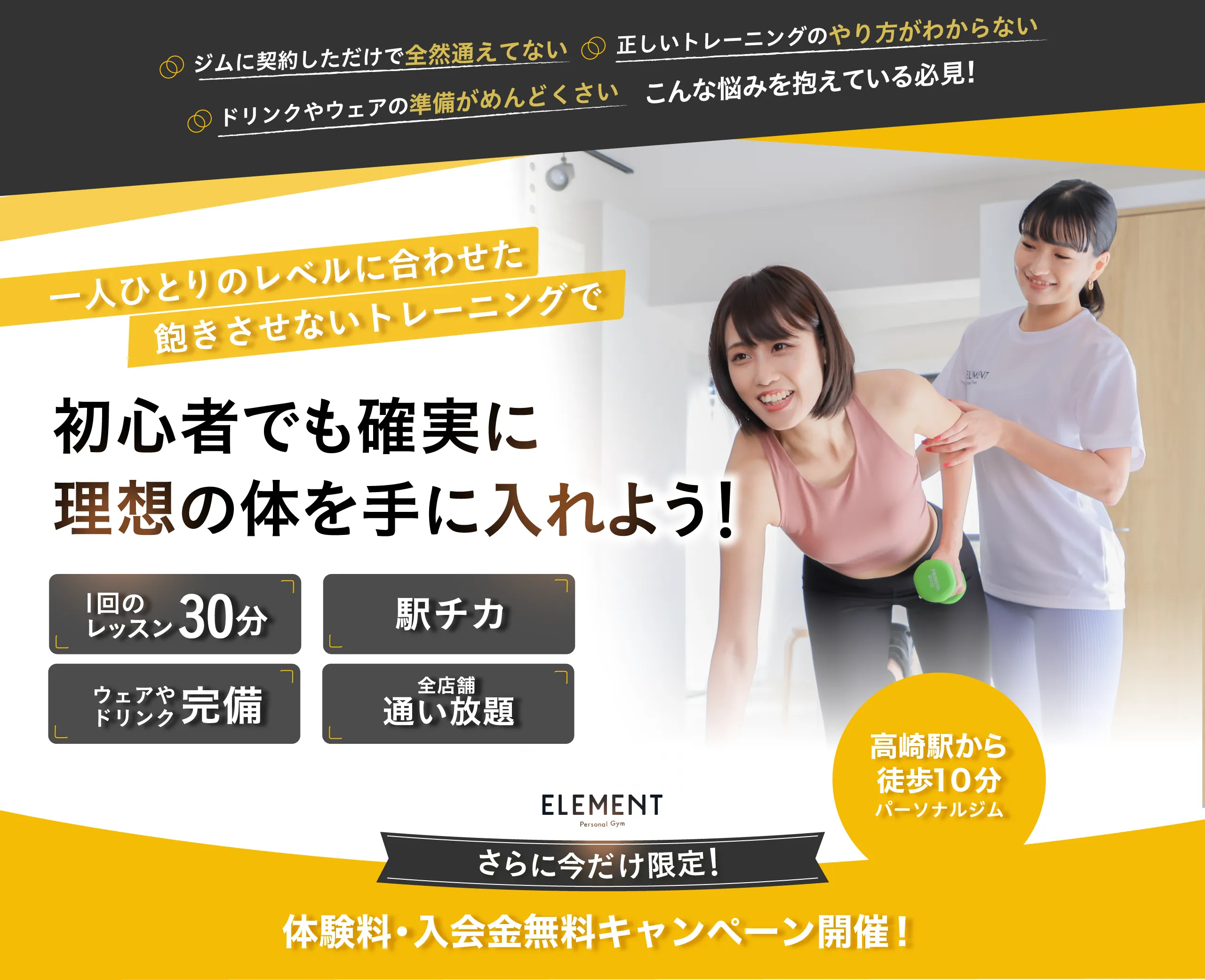 A. 大丈夫です。いままでに挫折したのは、「続ける仕組み」がなかったからです。ELEMENTのトレーニングは、「継続して習慣化すること」を目標として、継続できるプランを提案しています。また、トレーニングできつすぎる負荷をかけず、続けられる内容を組み、続けることを第一にしています。 習慣化さえできてしまえば、誰でも結果が出せるので、ご安心ください。
