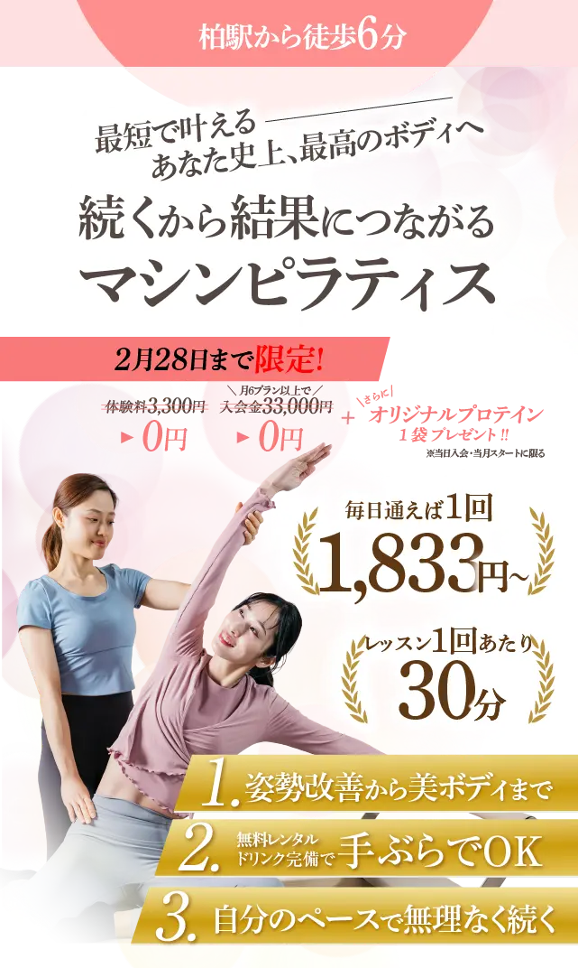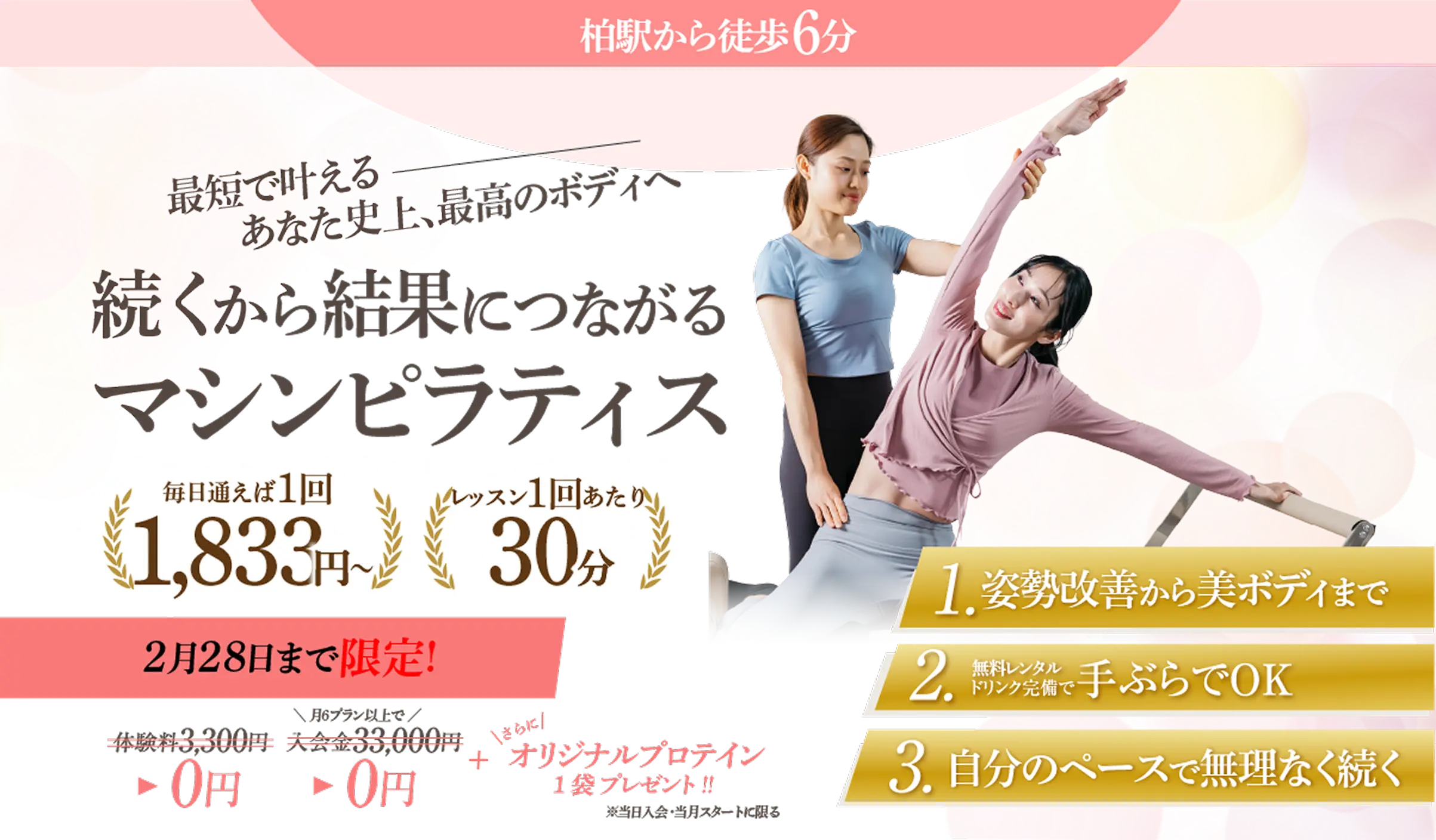初めてのマシンピラティスでちょっと緊張しましたが、トレーナーさんがとても丁寧に優しく教えてくださるので、安心して受けることができました。