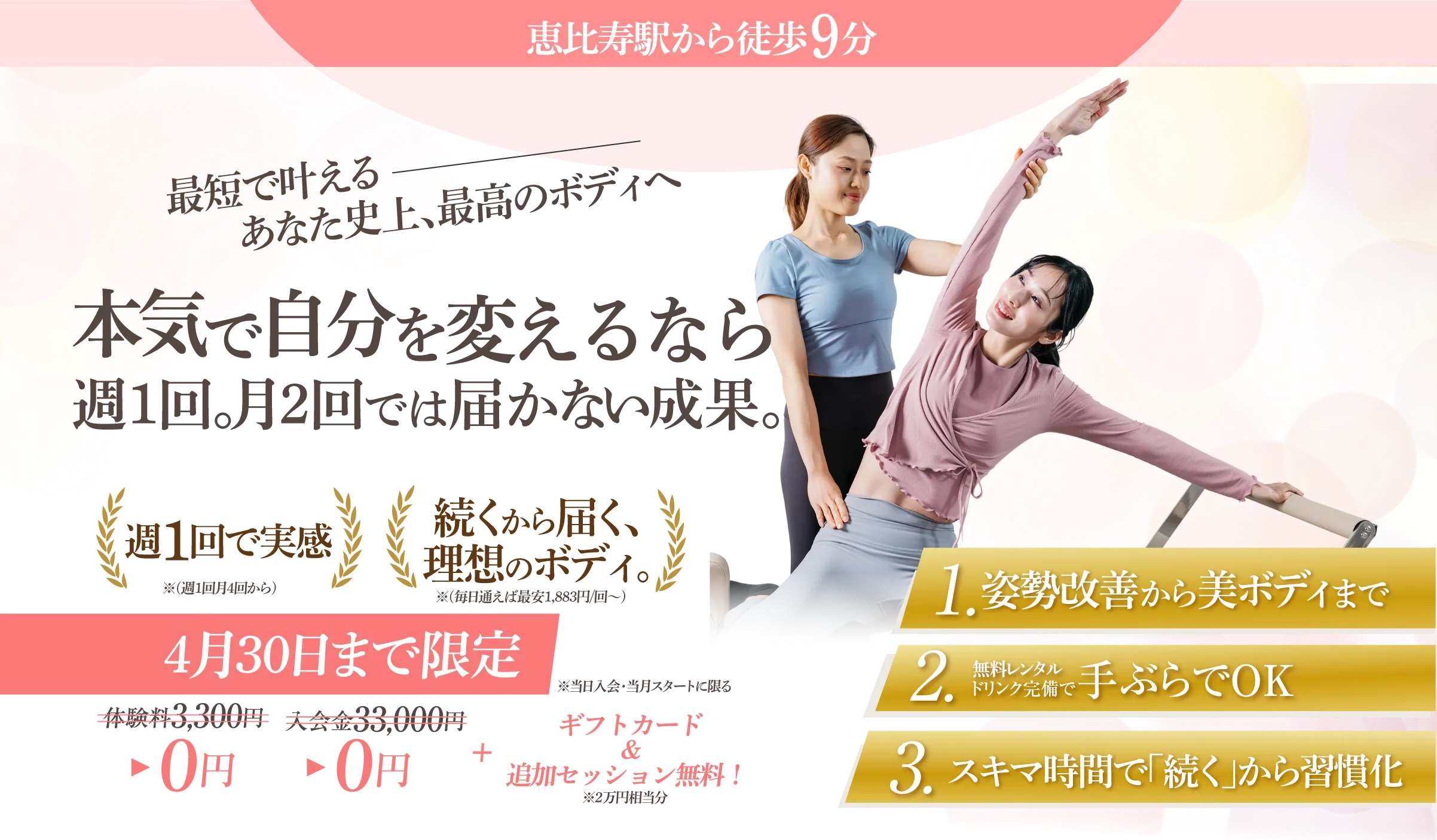 きれいなカラダを作るには、ピラティスを継続することが何より大切。続けやすい仕組みにこだわりました。