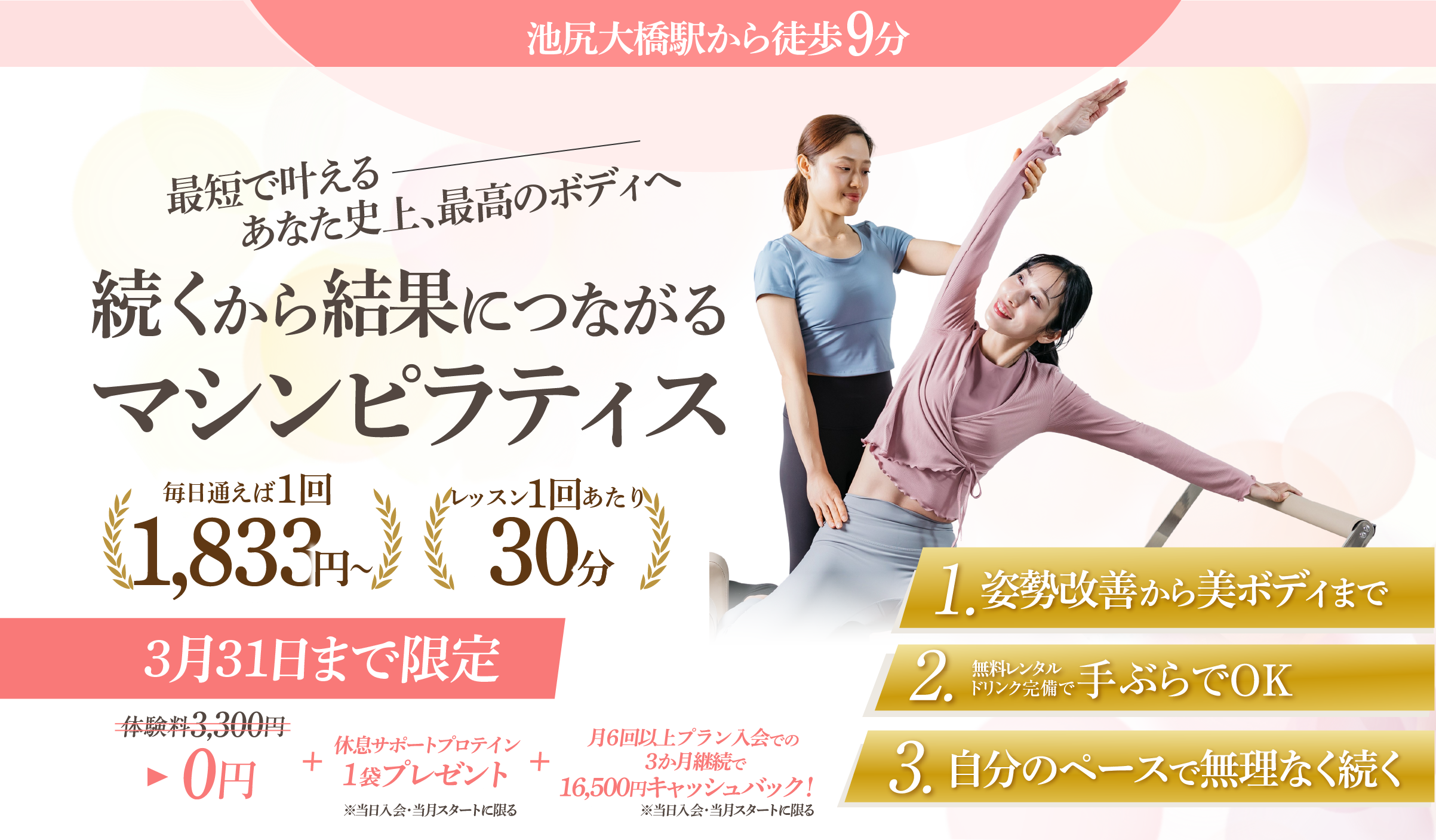 きれいなカラダを作るには、ピラティスを継続することが何より大切。続けやすい仕組みにこだわりました。