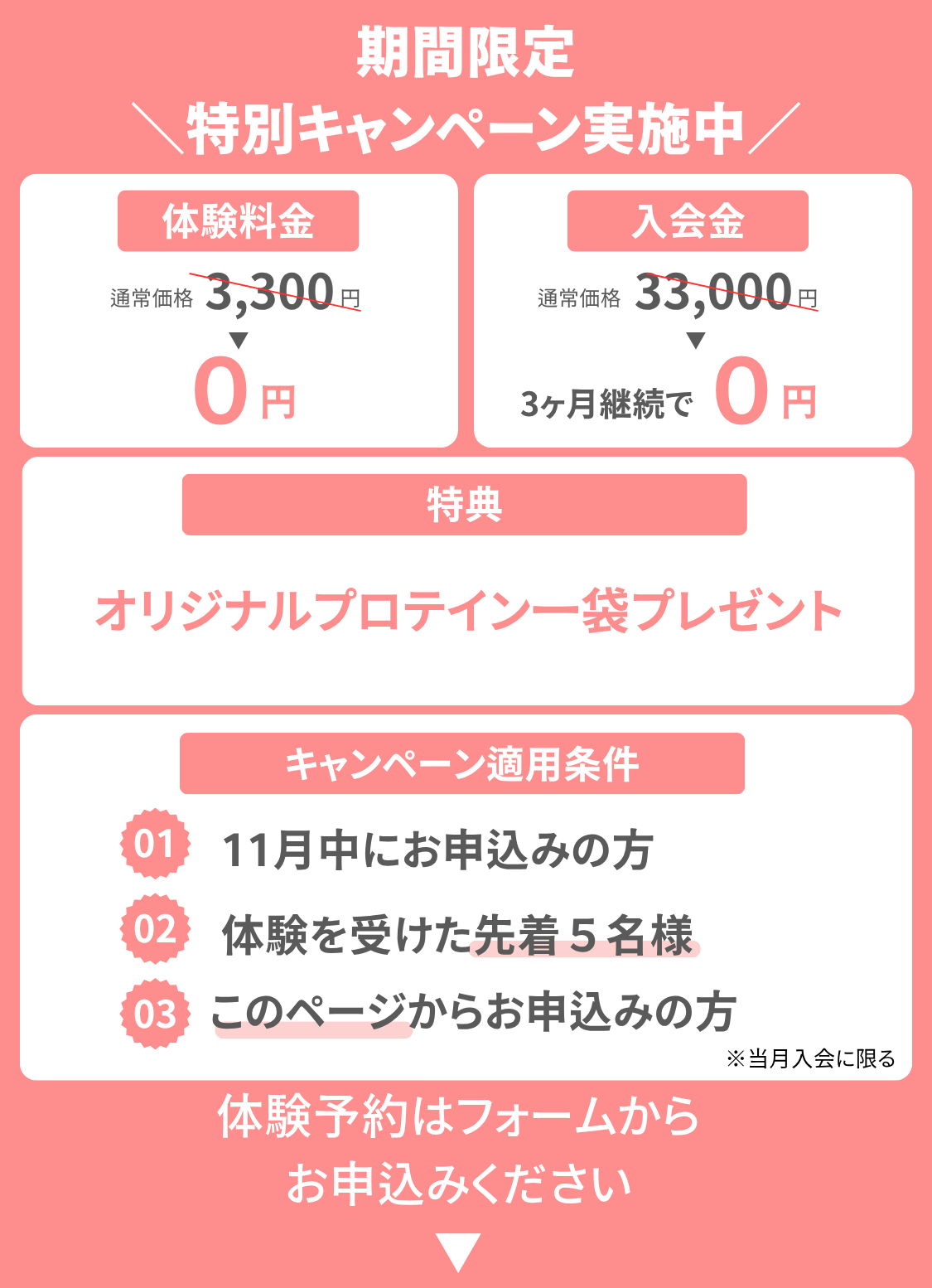30分のレッスンを実際に体験いただきます。 初心者や運動が苦手な方にも、しっかり個別でサポートするので安心してください!