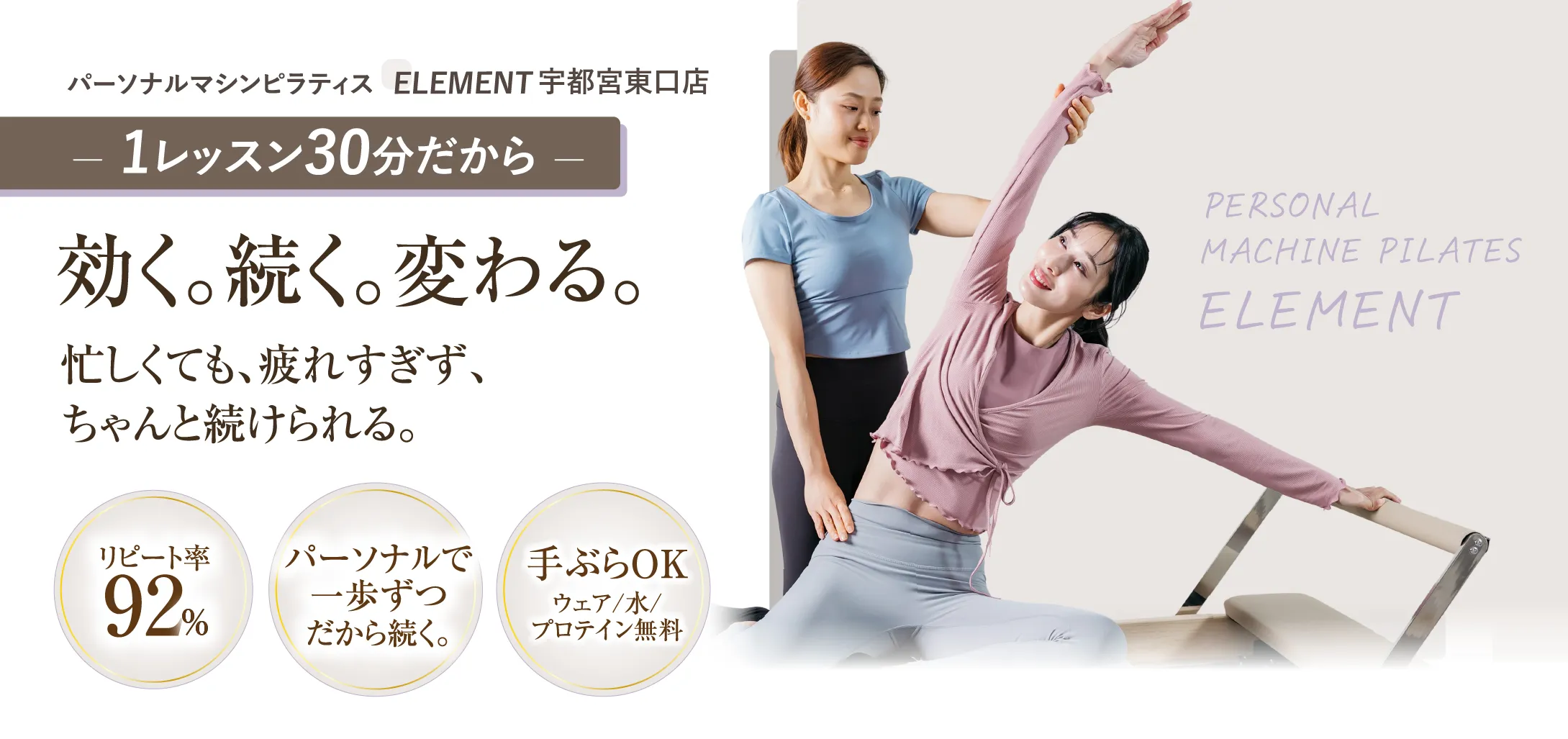 ELEMENTは本当に結果を出してほしいから、マンツーマンのピラティスを提供しています。