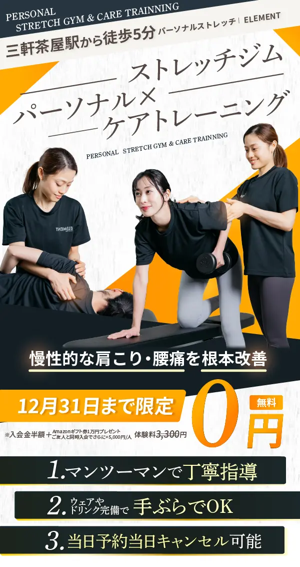 ELEMENTではパーソナルストレッチをした後に、その方の身体の機能を向上させるトレーニングも指導させていただきます。